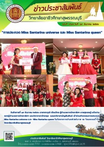 วันอังคารที่ ๑๙ ธันวาคม ๒๕๖๖ นายทรงวุฒิ เรือนไทย ผู้อำนวยการวิทยาลัยฯ นายสุรเชษฐ์ แก้วปาน รองผู้อำนวยการวิทยาลัยฯ และวิชาภาษาอังกฤษ แผนกวิชาสามัญสัมพันธ์ เข้าร่วมกิจกรรมการประกวด Miss Santarina universe และ Miss Santarina queen ในโครงการวันคริสต์มาส ณ โดมรวมน้ำใจ วิทยาลัยอาชีวศึกษาสุพรรณบุรี