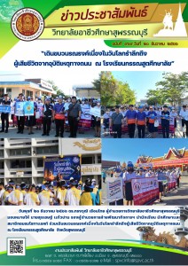 วันพุธที่ ๒๐ ธันวาคม ๒๕๖๖ ดร.ทรงวุฒิ เรือนไทย ผู้อำนวยการวิทยาลัยอาชีวศึกษาสุพรรณบุรี มอบหมายให้ นายสุรเชษฐ์ เเก้วปาน รองผู้อำนวยการฝ่ายพัฒนากิจการฯ นำนักเรียน นักศึกษาเเละสมาชิกชมรมโรทาเเรคท์ ร่วมเดินขบวนรณรงค์เนื่องในวันโลกรำลึกถึงผู้เสียชีวิตจากอุบัติเหตุทางถนน ณ โรงเรียนกรรณสูตศึกษาลัย จังหวัดสุพรรณบุรี