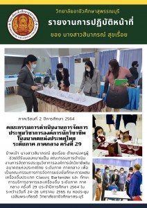 4 ปี ที่ผ่านมาครูผู้ควบคุมการแข่งขัน ทักษะการผสมเครื่องดื่มประเภท 'Classic Bartender' งานประชุมวิชาการองค์การนักวิชาชีพ ในอนาคตแห่งประทศไทย ระดับภาค ภาคกลาง ครั้งที่ 29 ข้าพเจ้า นางสาวสินาภรณ์ สุขเรื่อย ตำแหน่งครูผู้ช่วยได้รับมอบหมายเป็นคณะกรรมการดำเนินการฝึกซ้อมทักษะวิชาชีพและทักษะพื้นฐาน ระดับภาค ภาคกลาง ประจำปีการศึกษา 2564 โดยทำหน้าที่เป็นครูผู้ควบคุมทักษะการผสมเครื่องดื่มประเภท Classic Bartender ผู้เรียนได้รับรางวัลรองชนะเลิศอันดับที่ 4 กับค็อกเท็ล ที่มีชื่อว่า 'วันทอง' โดยนำนักศึกษาเข้าร่วมการแข่งขัน ในวันที่ 25 มกราคม 2565 ณ หอประชุมเฉลิมพระเกียรติ วิทยาลัยอาชีวศึกษาสระบุรี