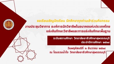 4 ปี ที่ผ่านมาขอเชิญนักเรียน นักศึกษาทุกท่านเข้าร่วมกิจกรรม งานประชุมวิชาการ องค์การนักวิชาชีพในอนาคตแห่งประเทศไทย แข่งขันทักษะวิชาชีพและการแข่งขันทักษะพื้นฐาน ระดับสถานศึกษา วิทยาลัยอาชีวศึกษาสุพรรณบุรี ประจำปีการศึกษา ๒๕๖๔ วันพฤหัสบดีที่ ๒ ธันวาคม ๒๕๖๔ ณ โดมรวมน้ำใจ วิทยาลัยอาชีวศึกษาสุพรรณบุรี