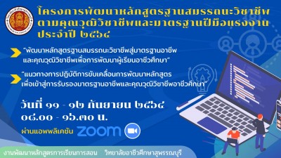 วันอาทิตย์ที่ ๑๒ กันยายน ๒๕๖๔ วิทยาลัยอาชีวศึกษาสุพรรณบุรี โดย ดร.ศรากร บุญปถัมภ์ ผู้อำนวยการฯ เป็นประธาน กล่าวต้อนรับ ดร.สิริชัย นัยกองศิริ ผู้อำนวยการวิทยาลัยเทคนิคมาบตาพุด ที่ให้เกียรติมาเป็นวิทยากรบรรยายหัวข้อ แนวทางปฏิบัติการขับเคลื่อนการพัฒนาหลักสูตรเพื่อเข้าสู่การรับรองมาตรฐานอาชีพและคุณวุฒิวิชาชีพอาชีวศึกษา ในโครงการพัฒนาหลักสูตรสมรรถนะวิชาชีพตามคุณวุฒิวิชาชีพและมาตรฐานฝีมือแรงงาน ประจำปี ๒๕๖๔ จัดโดยงานหลักสูตรการจัดการเรียนการสอน ฝ่ายวิชาการ วิทยาลัยอาชีวศึกษาสุพรรณบุรี ในรูปแบบออนไลน์ โปรแกรมZoom ณ ห้องพุทธรักษา วิทยาลัยอาชีวศึกษาสุพรรณบุรี