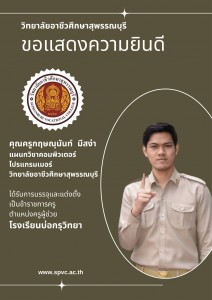 วันที่ ๑ มิถุนายน ๒๕อ๕ วิทยาลัยอาชีวศึกษาสุพรรณบุรี โดย ดร.ศรากร บุญปถัมภ์ ผู้อำนวยการฯ พร้อมด้วยคณะผู้บริหาร คณะครู และนักเรียน นักศึกษา ต้อนรับ รองผู้อำนวยการ อริยวัฒ เฉลิมกิจ ที่ได้รับการบรรจุแต่งตั้งให้ดำรงตำแหน่ง รองผู้อำนวยการวิทยาลัย อาชีวศึกษาสุพรรณบุรี พร้อมด้วยคณะครูจากวิทยาลัยอาชีวศึกษาพระนครศรีอยุธยา ที่เดินมา ส่งท่านรองผู้อำนวยการฯ ณ ห้องประชุมอุบล วิทยาลัยอาชีวศึกษาสุพรรณบุรี