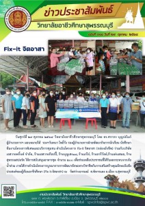 วันพุธที่ ๒0 ตุลาคม ๒๕๖๔ วิทยาลัยอาชีวศึกษาสุพรรณบุรี โดย ดร.ศรากร บุญปถัมภ์ ผู้อำนวยการฯ มอบหมายให้รองฯวันทนา โพธิ์รัง รองผู้อำนวยการฝ่ายพัฒนากิจการนักเรียน นักศึกษา ทีมงานโครงการพิเศษ และบริการชุมชนดำเนินโครงการ Fixit จิตอาสา (กล่องยังชีพ) ร่วมกับบริษัท เอสวายพริ้นท์ จำกัด, ร้านเอสวาย ก็อปปี้, ร้านบุญเฮง๑๘, ร้านเก๋ไก๋, ร้านอารีวัลย์, ร้านเด่นเสมอ, ร้านสุพรรณสปอร์ต ให้การสนับสนุนอาหารชุด จำนวน ๒00 ชุด เพื่อช่วยเหลือประชาชนที่ได้รับผลกระทบจากภัยน้ำท่วม ภายใต้การดำเนินโครงการบูรณาการ การพัฒนาทักษะทางวิชาชีพกับการเสริมสร้างคุณลักษะอันพึงประสงค์ของผู้เรียนอาชีวศึกษา (Fix it - จิตอาสา) ม.๓ ต.สนามชัย อ.เมือง จ.สุพรรณบุรี