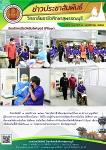 วันอาทิตย์ที่ ๗ พฤศจิกายน ๒๕๖๔ วิทยาลัยอาชีวศึกษาสุพรรณบุรี โดย ดร.ศรากร บุญปถัมภ์ ผู้อำนวยการฯ มอบหมายให้รองวันทนา โพธิ์รัง รองผู้อำนวยการฝ้ายพัฒนากิจการนักเรียน นักศึกษา และ ทีมงานสวัสดิการนักเรียน นักศึกษา นำนักเรียน นักศึกษา เข้ารับบริการฉีดวัคซีนไฟเซอร์ (Pfizer) เข็ม ๒ เพื่อป้องกันเชื้อไวรัสโควิด-๑๙ ณ โรงพยาบาลเจ้าพระยายมราช จังหวัดสุพรรณบุรี