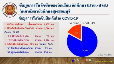 วันที่ ๒๘ ตุลาคม ๒๕๖๔ วิทยาลัยอาชีวศึกษาสุพรรณบุรี โดย ดร.ศรากร บุญปถัมภ์ ผู้อำนวยการฯ มอบหมายให้รองวันทนา โพธิ์รัง รองผู้อำนวยการฝ่ายพัฒนากิจการนักเรียน นักศึกษา และทีมงานสวัสดิการฯ นำนักเรียน นักศึกษา เข้ารับวัคซีน เข็ม , รอบเพิ่มเติม จำนวน ๑๙ คน ณ อุทยานมังกรสวรรค์ จังหวัดสุพรรณบุรี