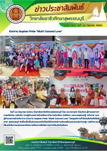 วันที่ ๑๘ มิถุนายน ๒๕๖๖ วิทยาลัยอาชีวศึกษาสุพรรณบุรี โดย ดร.ทรงวุฒิ เรือนไทย ผู้อำนวยการฯ และนายอริยวัฒ เฉลิมกิจ รองผู้อำนวยการฝ่ายพัฒนากิจการนักเรียน นักศึกษา และนายสุรเชษฐ์ แก้วปาน รองผู้อำนวยการฝ่ายวิชาการ ร่วมงาน Suphan Pride 'Multi Colored Love' โดยศูนย์การค้าโรบินสันไลฟ์สไตล์ สาขา สุพรรณบุรี จัดขึ้นเพื่อเป็นกิจกรรมหนึ่งที่มุ่งให้จังหวัดมีการขับเคลื่อนและยอมรับในกลุ่ม LGBTQ+และเป็นหนึ่งในการแสดงออกถึงความต้องการสิทธิความเท่าเทียมกันในสังคม